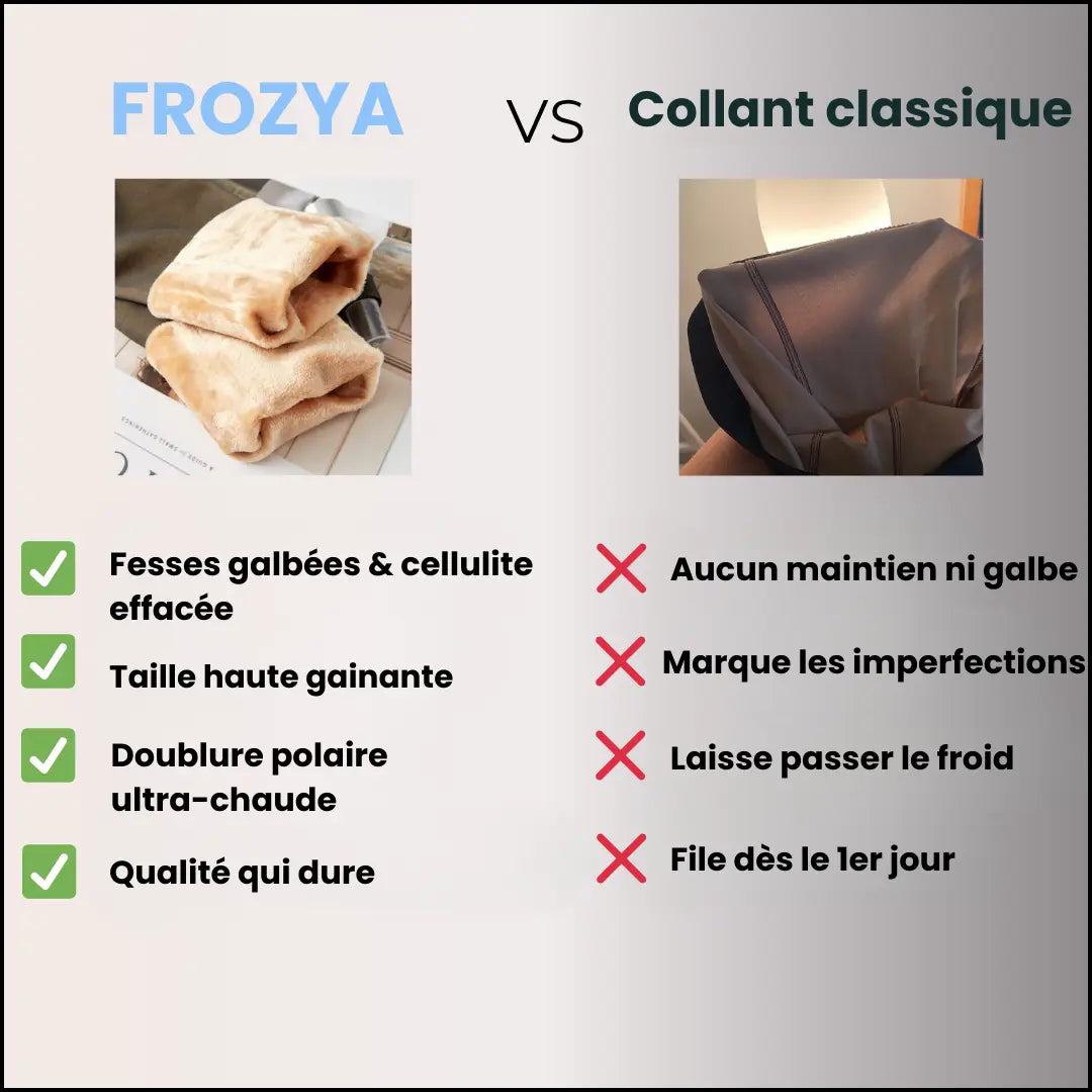 Pourquoi choisir entre avoir chaud et être élégante ? Frozya vous offre l'apparence parfaite d'un collant fin et transparent, mais avec la chaleur d'une doublure polaire toute douce. C'est l'alternative idéale au collant classique qui se file en deux minutes et qui ne protège pas du vent.