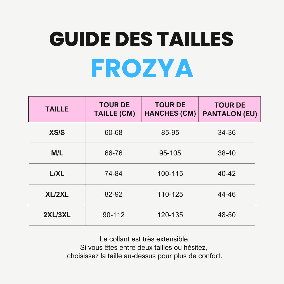 Contrairement aux modèles ordinaires qui glissent et roulent sans cesse, Frozya possède une taille haute gainante. Elle sculpte votre silhouette et maintient votre ventre tout en restant parfaitement en place sans jamais plisser. Peu importe votre morphologie, nos collants offrent un maintien sur mesure et un effet lissant qui floute la cellulite, les imperfections et les vergetures pour un confort total et une confiance absolue.
